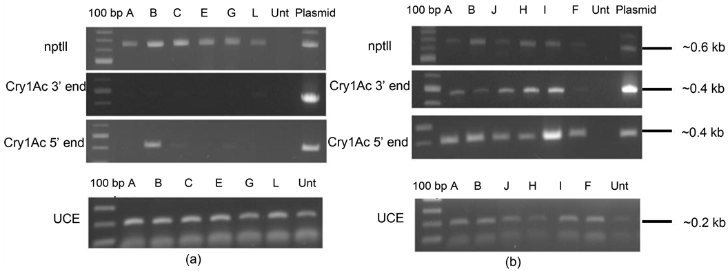 Amplifications were done on the selectable marker nptII gene, along with both 3’ and 5’ends of the cry1Ac gene to make sure that there was no truncation, using gene specific primers. Ubiquitin-conjugating enzyme (UCE) specific amplifications were carried out as internal control. The sequences of oligonucleotides that have been used for the amplifications are the same as used for the PCR amplifications on genomic DNA (Table 1).