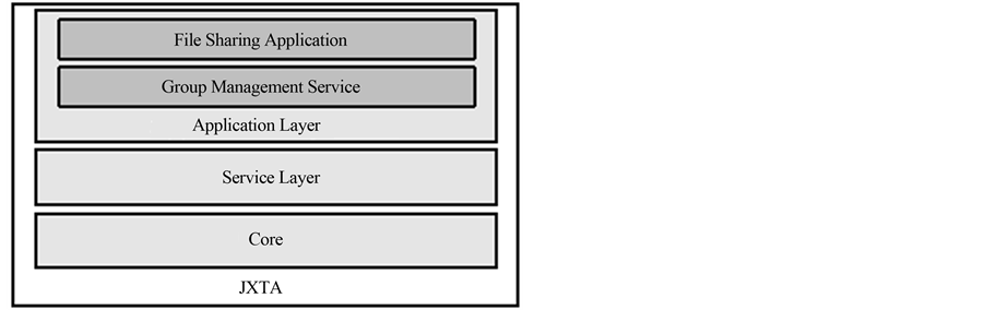 Figure 1 shows how the application and group service fit within the JXTA architecture. The JXTA network overlay, as well as several JXTA components and services were used to implement and run both the group service and the application. The JXTA core provides essential services, including basic operations such as the creation of peers with unique identifiers. The JXTA service layer provides non-essential but nevertheless important services, for example: peer authentication and content indexing. Another key JXTA component is the pipe, which corresponds to a communication channel between peers. The native JXTA peer groups were also used, as well as JXTA advertisements, employed to publish and find resources in the JXTA network.
