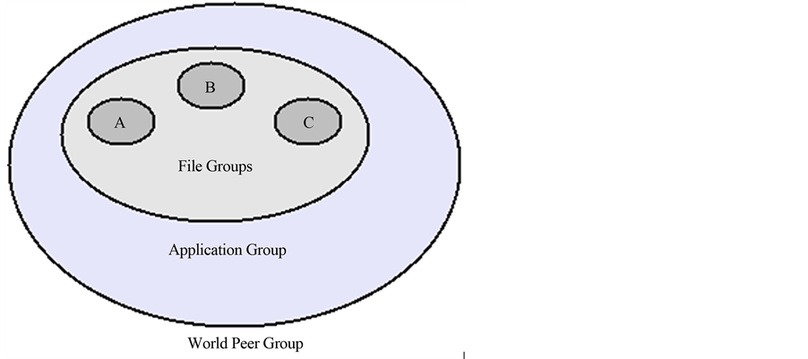 Peers are grouped hierarchically in a JXTA network. The main JXTA group is the World Peer Group, as shown in Figure 2. All other JXTA groups are created from this one. When a peer initiates the execution of JXTA protocols, it automatically becomes part of the main group. If the peer wants to access the content sharing application, it issues a search for the application group and then joins this group. At the lower layer, file groups are defined within the application group, three examples of which are shown in Figure 2: groups A, B and C. A file group is composed of peers that maintain a file they are willing to share. Each file group is responsible for keeping and making just one file available to other peers, peers can take part of as many file groups as they wish to, according to the number of files they are willing do share. The application groups are also JXTA groups. All members of these groups execute the content sharing application.