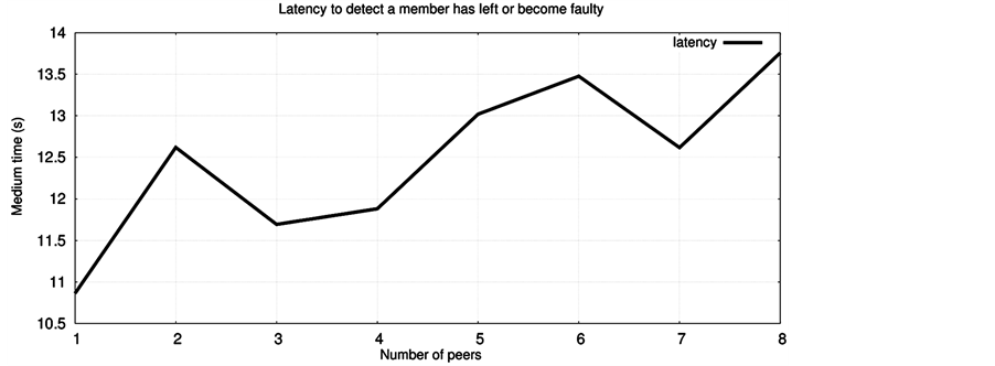 It is possible to conclude that the latency to detect that a member became faulty/left the group increases slowly as the number of members in the group increases. The latency was, in most cases, between 11 and 13.5 seconds, with an average of 12.8 seconds, or 1.3 heartbeat intervals.