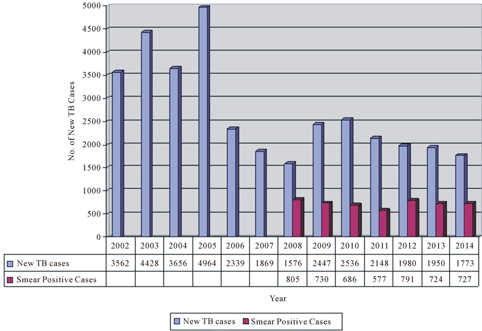 Data from Ndola DHMT show that there has been a downward trend in the number of new cases of TB from 2002 to 2014 in Ndola urban district (Figure 3). These could be due to improvement in TB intervention strategies such as Directly Observed Therapy Short course (DOTS) implementation. DOTS remain at the heart of the strategy to stop TB. DOTS consists of 5 main technical elements; political commitment, case detection through quality assured bacteriology, standardized treatment with supervision and patient support, an effective drug supply and management system and a monitoring and evaluation system that incorporates impact measurement [15] . Zambia adopted the WHO-recommended DOTS strategy as its primary approach for tuberculosis (TB) control in 1993 and has since achieved 100% coverage. Ndola district is one of the earliest to have implemented DOTS in Zambia [15] . In an effort to improve case management, Ndola District has benefited from the use of community volunteers and treatment supporters in their TB programme to assist in ensuring patients complete treatment. DHMT data for Ndola district for 2014 indicate a relatively high treatment success rate of 91% [29] . High treatment success rates may contribute to deceased notification rates and may indicate decreased TB transmission in the general public [22] . There has also been an improvement in diagnosis of TB, meaning that all the TB suspects are being confirmed as cases. Some years back, most cases of pulmonary tuberculosis were