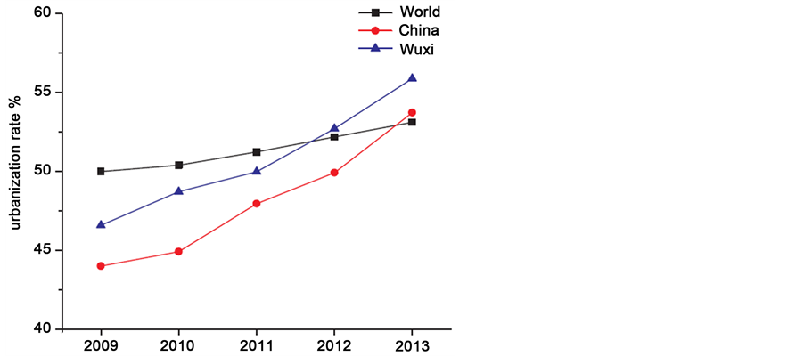 Figure 6. Development tendency of average urbanization rate (%) of the world, China and Wuxi City between 2009 and 2013. Source: Ba & Wang, 2013 .
