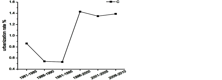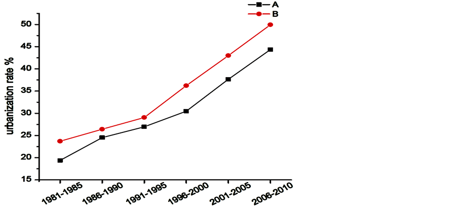 Figure 1 tracks the urbanization rate during six five-year plans. The black (A) trend line corresponds to the rate at the beginning of each five-year period while the red (B) trend line measures the rate at the end of each period. Overall, the beginning-end gap is wider for the last three five-year periods than for the first three timeframes, in other words, urbanization has accelerated over time. This is clearly illustrated in Figure 2. The data show that since 1996, urbanization in China has seen gradually higher average annual urbanization rates. During the period between the Ninth Five-Year Plan (1996-2000) and the Eleventh Five-Year Plan (2006-2010), the annual average urbanization rate has ascended by 1.43%, 1.35% and 1.39% respectively, far higher than the increases in urbanization rates during the period between the Sixth Five-Year Plan (1981-1985) and the Eighth Five-Year Plan (1991-1995).