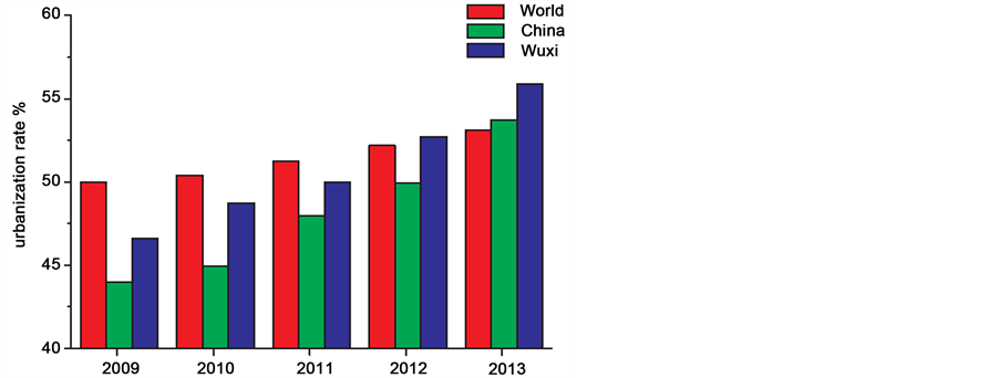 Figure 5. Average urbanization rate (%) of the world, China and Wuxi City between 2009 and 2013. Source: Ba & Yang, 2013 .