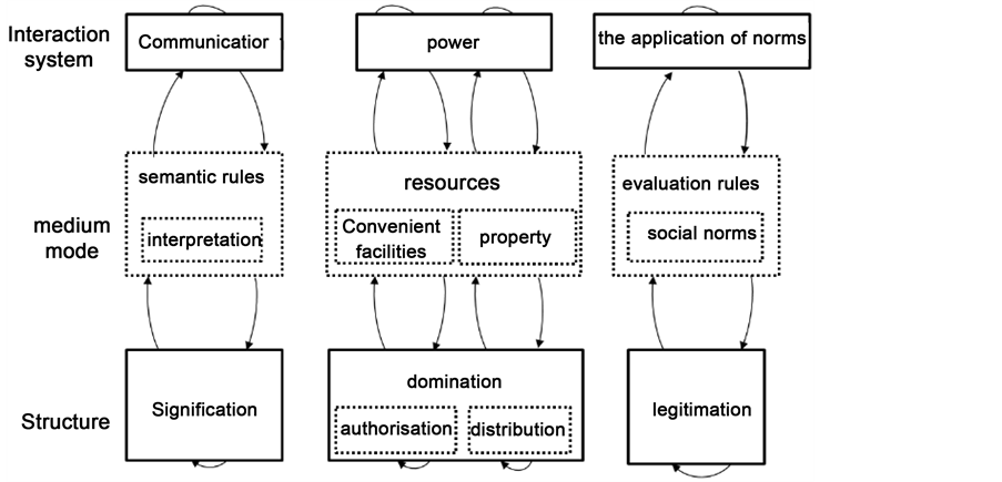 The idea of reflexivity is that the production of social life is the inertial result of segmental knowledge and ability (Gregory et al., 2009) . It is the constant reflection of one’s existence and the continuous being of surrounding world; whereas the core of recursiveness is that the structure consists of media and social practice. The rules and resource of a social system leads to the formation of social practice trough implications, domination and actors of legislation structure, and these structures in turn reproduces or converts through social practice, allowing agents to appear in the internal structures repeatedly; and regionalization is the continuum of social life generated by the interactions of presence and non-presence in the same space-time (Gregory et al., 2009) , thus allowing the connection between society and system integration to interact through regional organization of space-time; i.e. the members of a community or society are controlled by the regionalized pattern led by the path of space-time in their daily activities.
