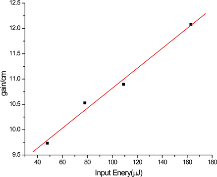 where is the amplified emission, is spontaneous emission, g is the net gain coefficient and is the stripe length. By fitting the experimental data to Equation (1), and taking as a fitting parameter, the gain coefficient for different input energy can be measured.