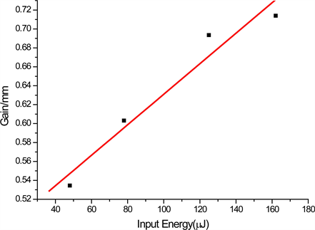 the figure, the gain increases as the input energy increase. Maximum output energy recorded was 11.2 μJ, for input energy of 162 μJ (efficiency of 6.8%). This is an indication of possible use of this compound as active media for laser action.