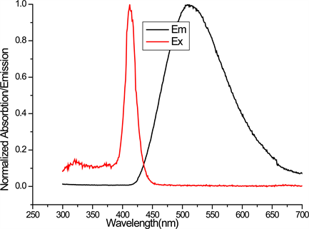 Figure 2 shows the absorption and emission spectra of DBE in THF. The emission spectra are a mirror image of the absorption spectra indicating that there are no other excited state involvements. Absorption maxima λmax occurs at 412 nm while the emission λmax occurs at 510 nm for excitation wavelength λ = 370 nm. The fluorescence spectra exhibit stokes shift of Δλmax = 98 nm (4664 cm−1) which is larger than that of organic fluorophores such as Rhodamine 6 G [13] Δλmax = 24 nm (Δυ = 823 cm−1). It is well known that the large Stokes shift eliminates spectral overlap between absorption and emission and allows detection of fluorescence while reducing interference [14] , therefore the studied compound may be considered for biological imaging and in vivo labelling.