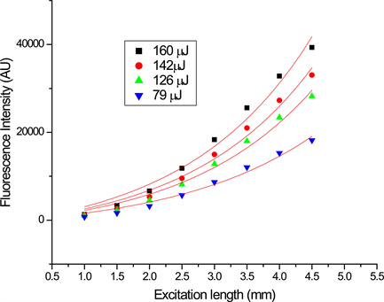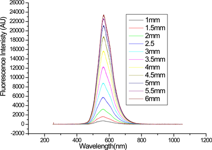 The variable stripe method was used to measure the optical gain from DBE. The laser beam from N2 laser (λ = 337 nm, pulse duration 1.2 ns and repetition rate 10 Hz) was used for photoexcitation. The beam was focused by a cylindrical lens with 10 cm focal length to form a rectangular stripe with a length of 5mm and width of 1 mm, in order to obtain the uniform intensity along the stripe length the two ends of the stripe were blocked and the experiment was performed with the central part of the stripe. The knife edge was placed on the translation stage and used to vary the excitation region. The emitted fluorescent was collected for different lengths of the stripe at a right angle to the direction of laser beam. The fluorescent signal was detected by CCD spectrometer. Figure 3 shows the evolution of the fluorescent intensity from the end of excitation stripe as a function of different stripe length at a fixed input energy (78 μJ) for the