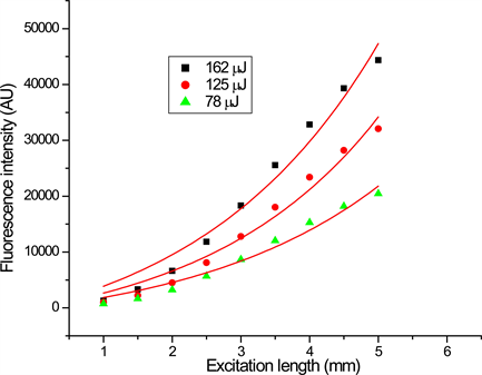 Figure 5(a), Figure 5(b) shows the emission intensity as a function of excited strip length for DBE in DCM and THF respectively. The solid lines in the figures are the best fit to the experimental data to the Equation (1), which yield the maximum gain of 12 cm−1 for the compound in THF and 7 cm−1 for the compound in DCM at the input energy of 162 μJ. Saturation was observed for longer excitation lengths and the fitting graph departs from the experiment data (not shown). The reason for this behaviour is explained above.