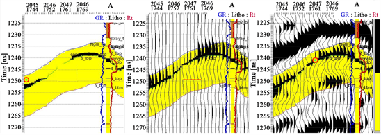 Model B (Mud-gravel Interlayer with Gradual Thickness): Compared with model A, the correlation between forward seismic modeling of model B and actual seismic is obviously improved, but the local reflection is different, which indicates that the thickness of local sand body of model B has deviated from the actual formation (Figure 4).