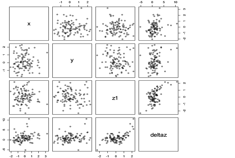 Figure 2 illustrates one realization of the data generation with in a pair plot. It can be seen from the figure that the distributions for, and are random (the upper left 3 by 3 plots). Furthermore, is linearly related to as seen from the upper right plot. The second plot on the right-side illustrates the linear relationship between and under fixed and the third plot on the right-side illustrates the cubic relationship between and. For, 3, and 4 (data not shown in figure), the corresponding pair plots would have larger variations.