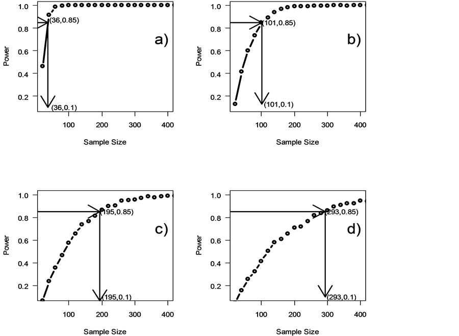Figure 3. Statistical power curves corresponding to in plot a), in plot b), in plot c) and in plot d). The arrows illustrate the sample size determination from power of 0.85 to calculate the sample size required.