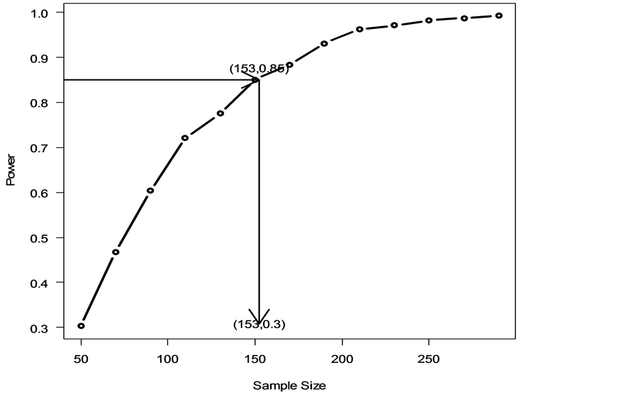 To verify the simulation-based method, the parameter effect size estimates were obtained from the paper with, and the data-model fitting error was obtained by accessing to the original computing records. With these estimates, the simulation-based approach in Section 3.2 is applied. Figure 4 presents the sample size-power curve. From the figure it can be seen that the estimated sample size is 153 to achieve 85% power. This sample size is much smaller than the sample in the original study.