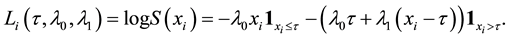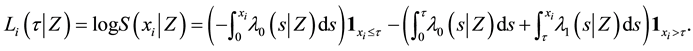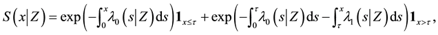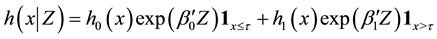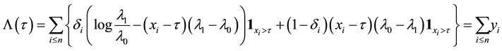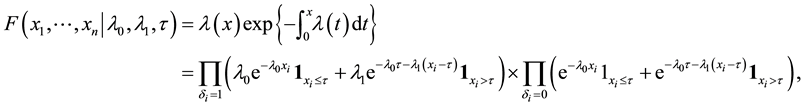 This situation is conceptually and mathematically different from the classical change-point model, see e.g. [10] - [14] , where observations follow one distribution before the change point and another distribution after it. In the described scenario, with one or several changes in the failure rate, all the subjects are assumed to have the same distribution. Each change point is understood as a parameter of this distribution that separates two patterns, two different models for the failure rate, and typically, it is the moment of a “clinically significant” reduction of the failure rate.