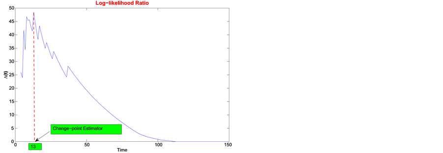 2) Using the least squares method, the estimate for change point is 14.2373 and the failure rate drops from 0.1281 to 0.0142, which are very close to the results from maximum likelihood estimate. The graph of error sum of squares is in Figure 2, right.