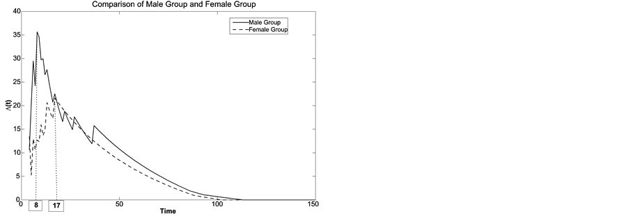 1) Using the method of maximum likelihood, the estimated change points for males and females are 8 and 17 from Figure 3, left. However, the likelihood ratio test fails to detect a significant difference between the genders with the p-value of 0.3203, i.e., there is no evidence that there are any significantly different change points for males and females. The failure rate reduces from 0.1649 to 0.0201 for males and from 0.1387 to practically 0 for females.