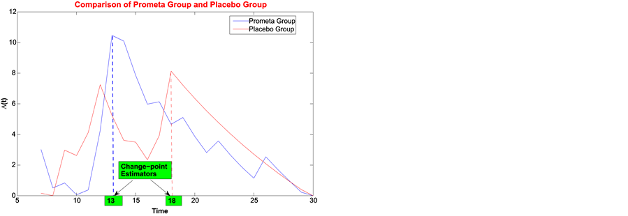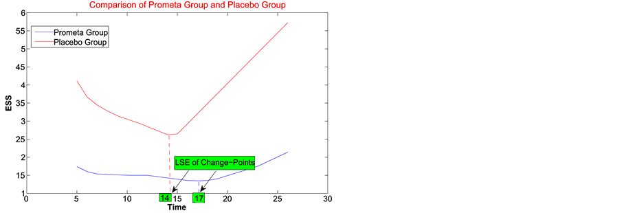 Figure 4. Least squares estimate of change-point for Prometa and Placebo groups.