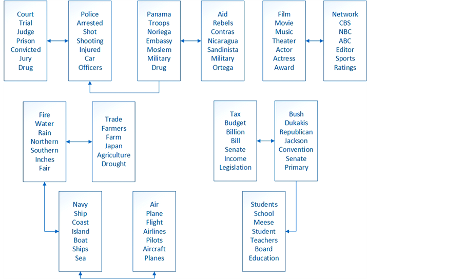 As we see, the optimal number of topics in this case is 30. In Table 2, we show a subset of the 30 topics uncovered where each topic is represented by the 10 most frequent words. It can be seen that our probit normal topic model is able to capture the co-occurrence of words within topics successfully. In Figure 2, we also show the correlation structure between various topics which is the essential purpose of employing the correlated topic model. Evidently, the correlation captured intuitively reflect the natural relationship between similar topics.