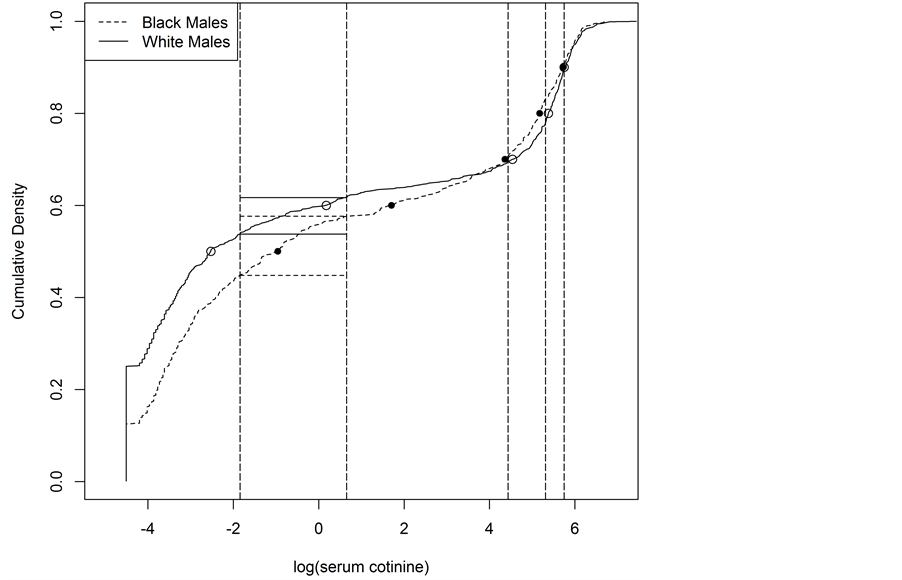 Figure 1. Cumulative distribution functions of log (serum cotinine) for black and white males, including dots for the respective 50th, 60th, 70th, 80th, and 90th sample percentiles. Vertical lines indicate location of combined sample percentiles.
