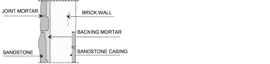 Figure 4. Bulding matrials of Helal mosque, external wall assembly consists of sandstone, joint mortar, backing mortar, eternal wall from brick wall, sandstone cladding at the low part from brick wall with height 120 cm.