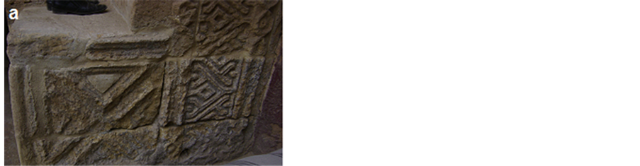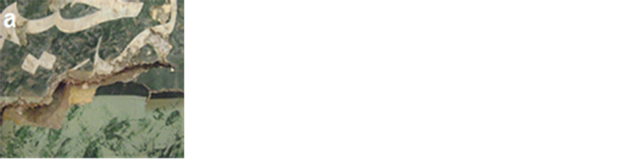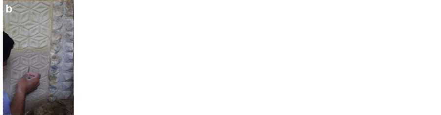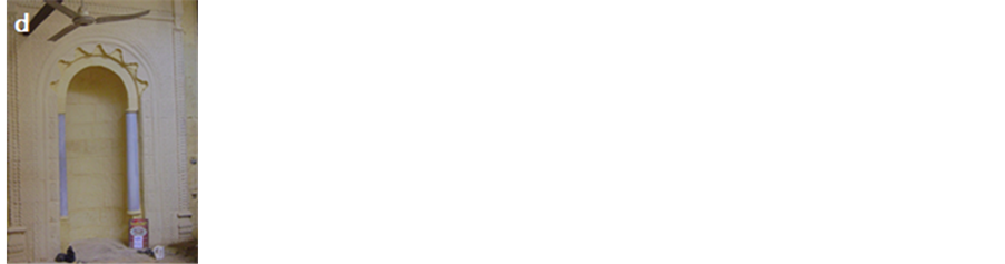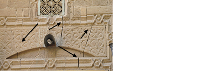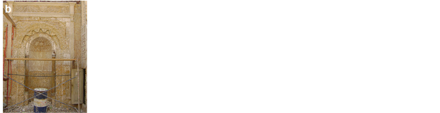 overall strength of the stone and bricks [2] . In addition, many brick blocks are seriously lost their internal cohesion, resistance and big numbers of these bricks become weak and some blocks were completely lost. Much more serious, however, was the impact of the development of damaging salts, which led to further total loss of the old plasterwork of the both in internal and in external walls and losing of mortar’s joints which threaten the physical structure of the brick walls were observed clearly. Moreover, many areas show an extensive network of cracks associated with a spread surface and detachments, cracks in the wall allow water to penetrate into the stone and bricks increasing its moisture stress and deterioration. Additional factors that cause damage to the mosque include mishandling, worsened by writings, neglect and other vandalism action like the great number of worshippers. One of the most important reasons for degradation at Helal mosque was the old faulty restoration. The old restoration at the mosque was done by using strong Portland cement mortar and industrial lacquers, many Islamic decorations in the mosque façade disappeared (Figure 7(a)), because of these mortars and many aspects of damage as peel off the layers of stone and brick surface were noticed due to salt generated by using Portland cement. Pollutants attack Portland cement and leading to an increase in volume and consequent disruption of mortars and masonry. Concrete may erode due to the action of weather and pollutants [3] . In addition, modern lacquers, piece of carpets and industrial oily paints were used in covering the prayer niche (Mihrab) and motifs surround, this led to the disappearance of these ornaments from the viewer (Figure 7(b), Figure 7(c)), “Observations after the removal of the salt contaminated plaster and Portland cement areas revealed these decorations during restoration process”. The action of natural weathering agents and environmental pollution on the stone facade has compounded. Therefore, dirt, dust and black rust covering the façade.