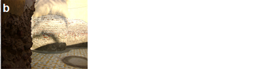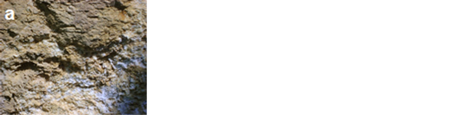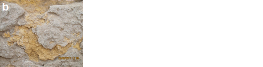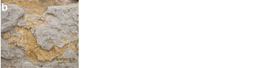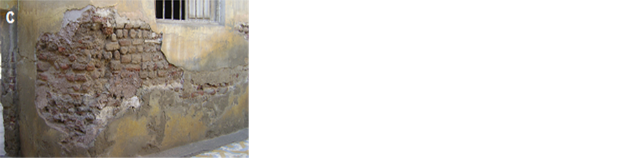 Figure 6. Photograph of decay features common at the Helal mosque. a―Efflorescence’s to light-colored crust tracing the surface; b―Scars of flaking, c―Lost in brick, detachment of plaster and soiling by groundwater at the lower part of the mosque.