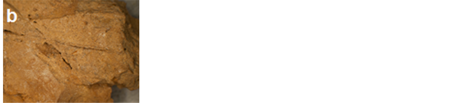 consists of calcite and quartz.EDX microanalysis of brick sample (Figure 16(a)) showed that Si, Ca, Fe were the major elements in the sample. Considerable amounts of Al, Mg, K and Cl were also recorded. The EDX analysis confirmed the brick mortar consists of Ca, Si, as a major elements and small amount of Fe, Mg and Na (Figure 16(b)). Considering the EDX results, it can be concluded that, the brick consists of quartz, feldspar, calcite, iron oxide and halite as salts. Furthermore, the brick mortar is lime mortar that contains of calcite, quartz and halite. These results confirmed the XRD results. SEM microscope observation of brick (Figures 17(a)-(d)) shows that, there are some cracks, gaps and voids which led to the disintegration, separation, thus erosion and weakness of the brick internal structure. Also, dissolving of some brick components and crystallizing some types of salts were detected. SEM study also indicated growth of hyphae of fungi and remains of alga inside the brick. Furthermore some fibers were observed, which were added during brick making process. Results of the scanning electron microscope investigations showed that the surface of brick mortar was fragmented and damaged, the surface that contains halite crystals, sand and lime (Figures 17(e)-(f)).