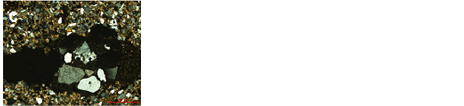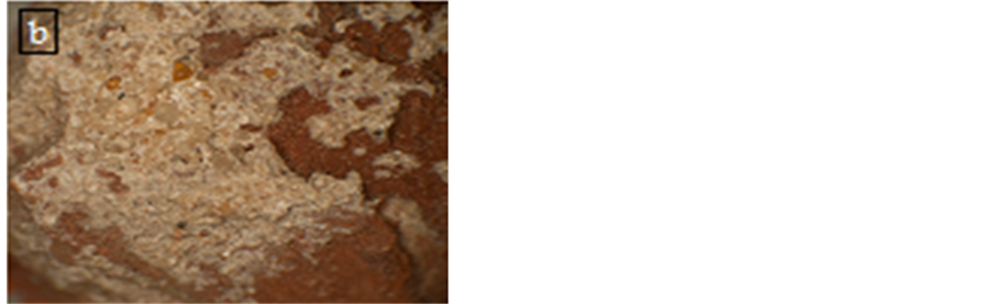 Examination by light optical microscope (LOM) confirmed a lot of deterioration features at the brick samples, the photograph shows cavities, cracks and macro crack as a result of crystallization and pressure salts. In addition, the examination showed thread of lime mortar overlap the outer surface of a brick surface with gaps, with the presence of grains of sand, graduated from the size of the average flour (Figure 13). Petrographic study of bricks (Figure 14) shows the heterogeneity of the archaeological brick components by the existence of precise and coherent fabric of granules, color gradient inside the samples as a result of the conditions of burning was observed and small proportions of calcite (lime) which serves to control the temperature and works to connect granules bricks earned cohesion was found. This study indicated the brick consists mainly of quartz, iron oxides and clay minerals. Furthermore some burning fibers were observed, which were added during brick making process. X-ray diffraction (Figure 15(a)) indicated that the brick consists mainly of quartz (SiO2), Albite