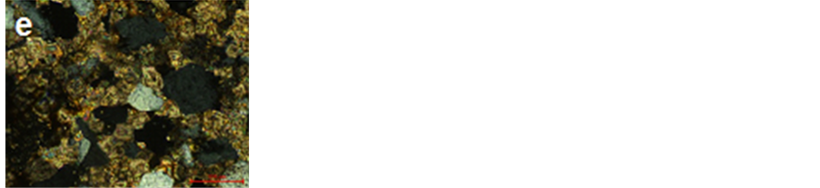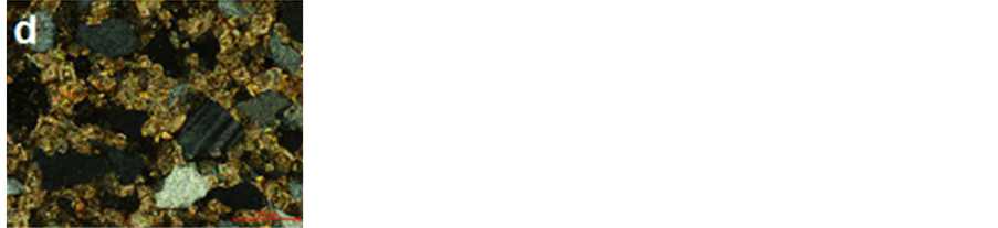 Figure 9. Mineralogical characteristics of the sandstone in the façade of Helal mosque. a―Minerals content of sandstone samples; b―Subrounded grains of calcite; c―Turbid color of quartz grains by clay minerals; d, e―Crystal of dolomite between quartz grains; f―Rhombohedral twins of dolomite grains.