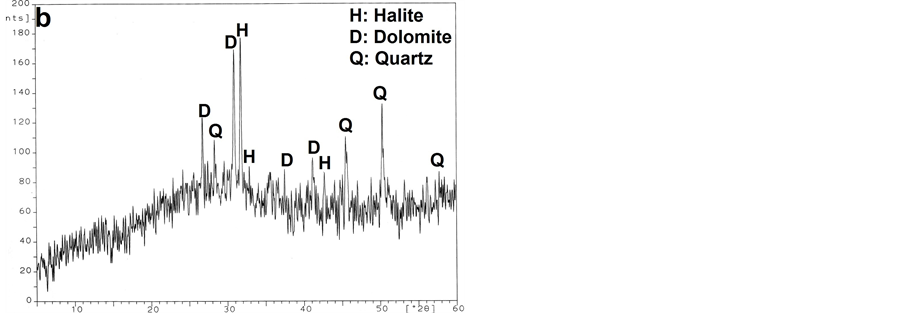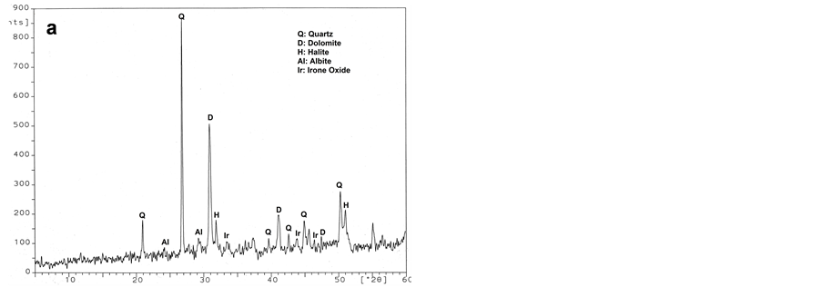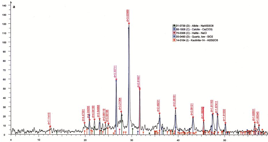 (NaAlSi3O8), calcite (CaCO3), in addition to halite (NaCl), iron oxide and clay minerals. Furthermore, the analysis of brick mortar (Figure 15(b)) shows that the sample consists mainly of calcite, quartz, albite, iron oxide and halite. On other hand, XRD analysis of plaster layers of the interior walls of the Helal mosque shows that it