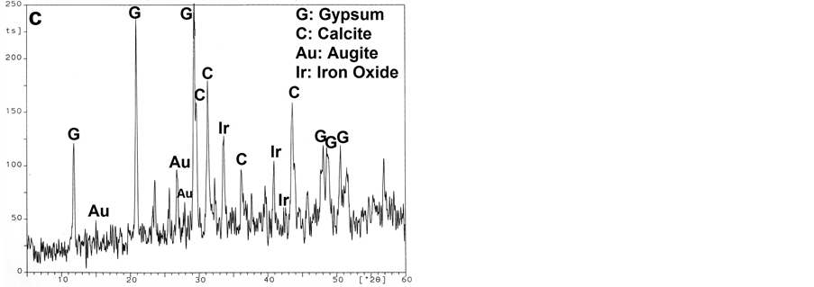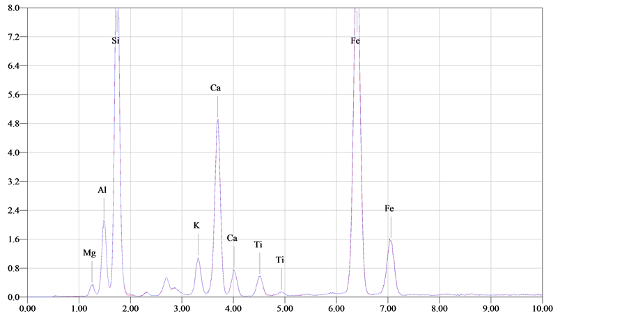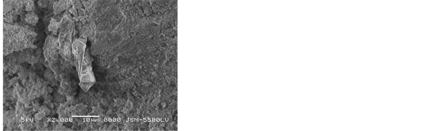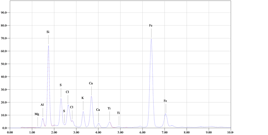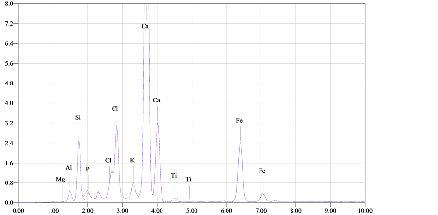 Light optical microscope reveals that, the samples suffer from several deterioration of its structural coherence, the photograph shows cavities, cracks and macro cracks disintegration, chosen of quartz grains, fossils and iron concentration. In addition, LOM photographs reveal that affected chemical process produced micro-fractures and cleavages dissecting the quartz grains into several sub-individual grains as it shown in Figure 8. Petrographic study using polarized light (PL) and crossed nicols (XN) prism confirmed that the stone used in the facade of the mosque consists of such rock-forming minerals as quartz, rock fragments, dolomite, plagioclase and microcline (Figure 9). Quartz crystals are angular to subrounded in shape and fine to medium grained. Quartz grains occur as turbid color, they are surrounded by feldspars (partially altered to Sericite) with cement of dolomite and iron oxides. Dolomite crystal appears as transparent to translucent in appearance and the crystal habit include saddle-shaped rhombohedral twins. Due to the high concentration of quartz and high amounts of dolomite and feldspars and other lithic fragments, the sandstone can be classified in petrological terms as dolomitic sandstone. X-ray diffraction (Figure 10) results identified quartz (SiO2), dolomite (Ca, Mg CO3), albite (NaAlSi3O8), hematite (Fe2O3) and halite (NaCl) and they were marked with high peak. According these studies, it can claimed that, the stone in the façade consisted of Quartz as a major minerals and high ratio of dolomite (Dolomitic sandstone). The results of salt sample found at the surface of the stone indicate that a highly weathering occurred on the sandstone by halite salts that observed clearly by SEM. Mineralogical investigated of the mortar between stone blocks in the Helal mosque façade confirmed that, it consists mainly of calcite and gypsum as major, quartz as a minor, hematite and augite as traces. It can claim that, the stone mortar consists of mixture of gypsum, lime and a little amount of sand. EDX microanalysis of the stone sample (Figure 11) showed that Si, Mg, Fe, Ti, Sr, Cl and Na. Considering this results, it can be claimed that, the stone samples consists of quartz, dolomite, feldspars and heavy metals (Fe, Ti and Sr) generally increase in the outermost surfaces of the black crusts relative to the sample interiors. This attributed to polluted gases derived mainly from diesel engine exhaust, which is primarily composed of soot and metallic particles bearing Fe and Fe-S as major elements, Ti, and Sr as trace elements. These elements play a major role in the catalytic oxidation rates of SO2 [4] . The SEM examination micrographs (Figure 12) of some degraded stone samples from the façade of Helal mosque revealed, the sample consists mainly of quartz grains cemented with dolomite and iron. It also showed the major