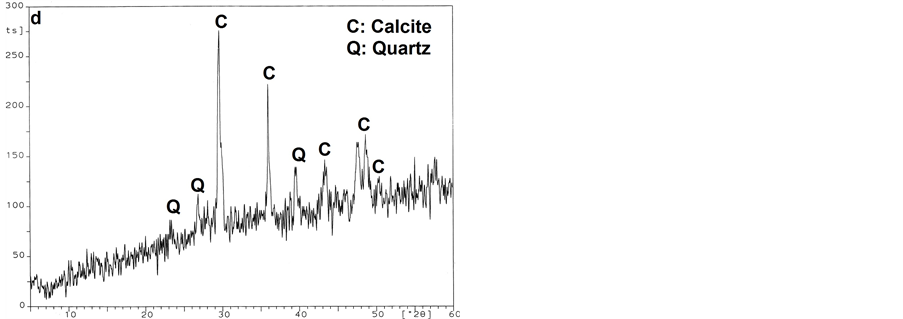 Figure 10. XRD pattern of building materials of Helal mosque. a―Sandstone samples; b―Salt samples; c, d―Mortar samples.