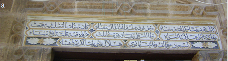 Figure 1. The façade of Helal Mosque. a―Founding text shows the erection and the date of the mosque erection; b―The tall portal of the mosque with Islamic decoration; c―The rest of the façade of the mosque.