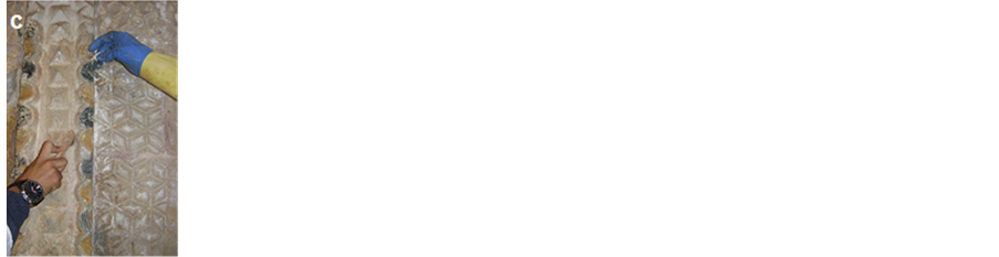 Figure 19. a, b, c―Removing the old restoration with Portland cement and lacquers and revealed the Islamic decoration by mechanical cleaning.