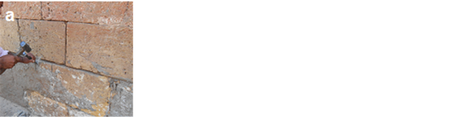 -When it was necessary to provide support for surfaces, impregnation with Ethyl silicate with a sprayed with hand sprayers was carried out on very disaggregated areas of decoration to restore some strength because of its ability to penetrate the stone, resulting from it’s a low viscosity and a low contact angle of, its ability to link between the grains of mineral constituents of the stones and the surface of the stone become water-repellent [6] . The Ethyl silicate applied to the surface with paying attention to avoid any overflow.