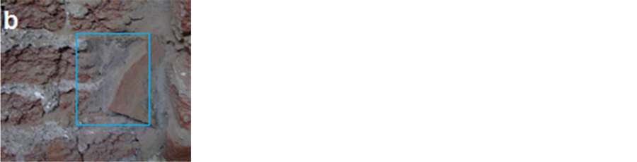 Figure 23. The restoration intervention at the brick walls. a, b―The brick wall after removing the deteriorated old mortar with salts; c―After restoration.