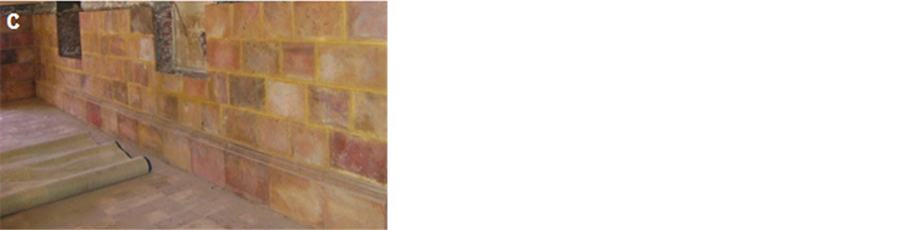 Figure 22. Casing the inner walls of the mosque of brick with sandstone tiles as it was in ancient times. a―The walls covered with Portland cement and new paints; b―During removing the cement mortar, the old tiles of sandstone appeared under the cement; c―After restoration.