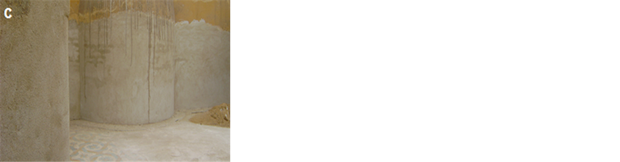 Figure 7. Old faulty restorations by Portland cement. a―Disappeared of Islamic decorations in the mosque façade by cement; b―Old restoration around mihrab which covered the decoration with Portland cement, industrial lacquers and carpet; c―The decoration was covered with lime and gypsum. Collapse of large parts of the ceiling of the mosque, especially north arcade.