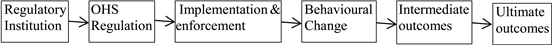 Regulation refers to laws or rules that have their origin in the legislative arm of government which seek to effectively manage OHS issues that negatively impact on persons whether employed or not. According to [38] , the effectiveness of regulations must consider the regulations, implementing organisations and other organisations or individuals whose behaviour the regulations seek to regulate. The consequence of effective implementation and enforcement of OHS regulations is desirable behavioural changes in regulated organizations which will lead to desired intermediate outcomes and ultimately, reduced accident rates in regulated organisations or occupations covered by the regulation (See Figure 1).