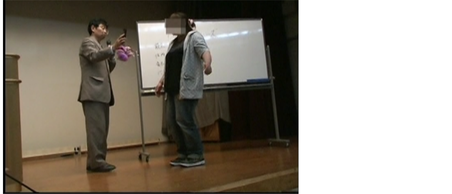 A woman in her twenties experienced a loss of balance when a cell phone was held at a distance < 50 cm from her body (Figure 5). The patient’s medical history was unknown because she was a volunteer who was selected from an audience during one of the author’s lectures. When a titanium implant was placed on her chest, she leaned backward, although the distance between the subject and the cell phone still exceeded 3 m (Figure 6).
