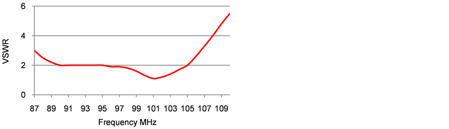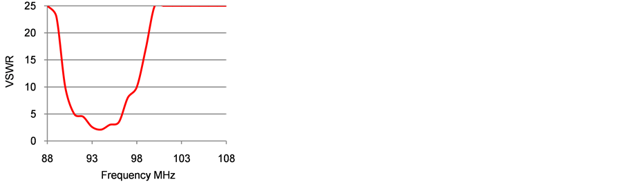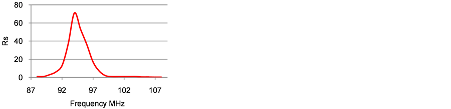 The radiation resistance (Rs, the real part of the impedance) has been measured by the use of the VSWR analyzer MFJ 269C and the results are illustrated in Figure 2. As can be seen from the graph, at 93 MHz, the radiation resistance is close to 50'Ω. At other frequencies within the Band II, the radiation resistance becomes very low; thus, the antenna has a very narrow band response [8] [9] [10] [11] .
