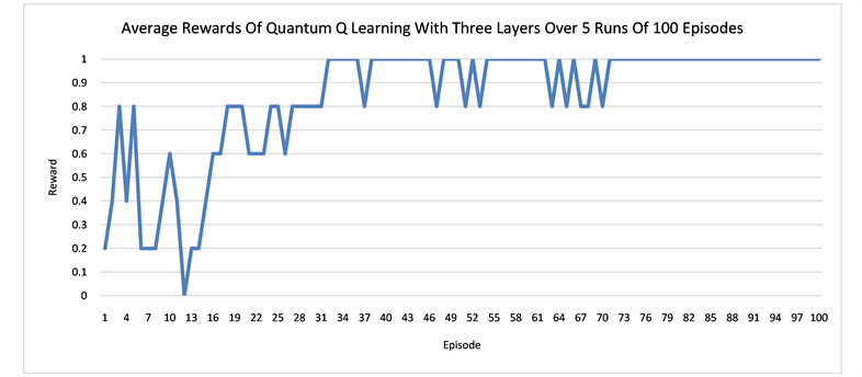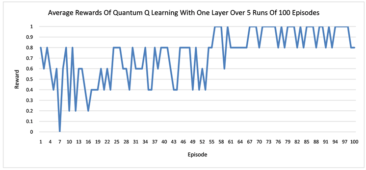 Our quantum Q learning and actor-critic algorithms are evaluated in the grid world environment explained in Section 3.1. The aim of the agent in this grid world is to learn how to navigate from the start state S to the goal state G with a reward of 1 without falling into the hole with a reward of 0. Our purpose is to investigate the power of using quantum neural networks with many layers in RL, so we test our quantum networks with one layer and with three layers respectively.