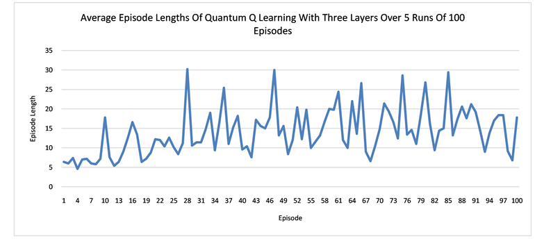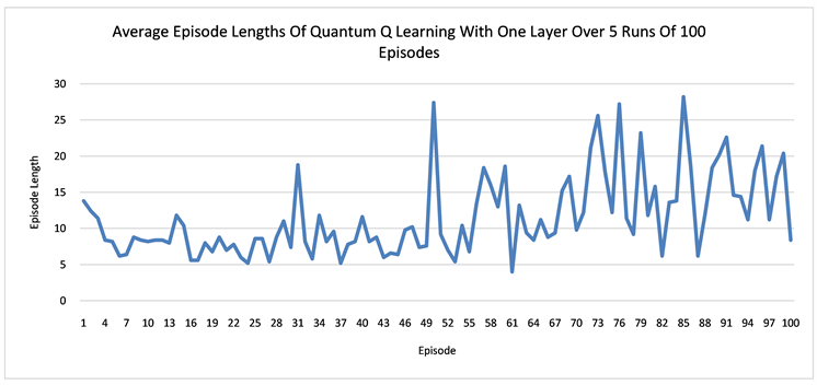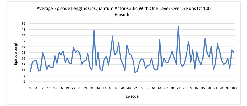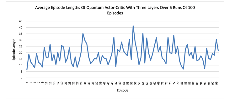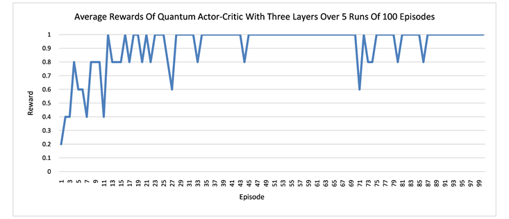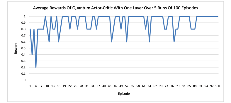 We run several numerical experiments using the Strawberryfields software [33] to simulate our quantum networks, and then take the average of the rewards and path lengths in each case. The results suggest that having more layers in the network can result in better learning. One episode is defined as a sequence of moves from the start state S to a terminal state that can be either the hole H or the goal G in our grid world. The learning curves for the quantum networks of one layer and three layers are displaced respectively in Figure 4. In both Q learning and actor-critic, the networks with three layers converges earlier than the one layer and also more stably. It also seems that in order to avoid the hole H, the agent needs to walk more steps in order to arrive at the goal state G. In other words, earning more rewards requires more work. At the beginning, the agent tends to fall into the hole easily and produces shorter average episode lengths. Only later in the learning, it gradually learns how to avoid the hole.