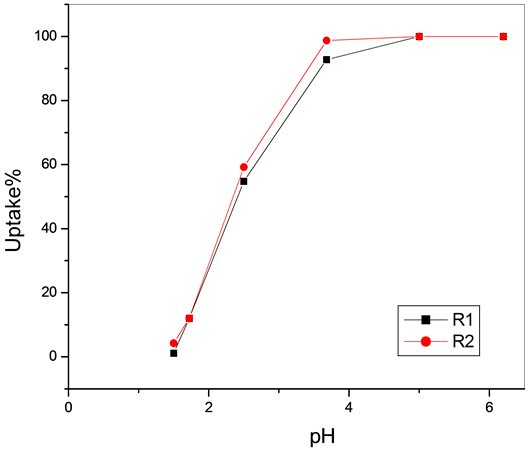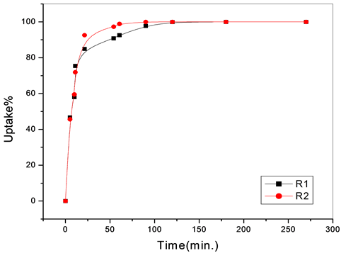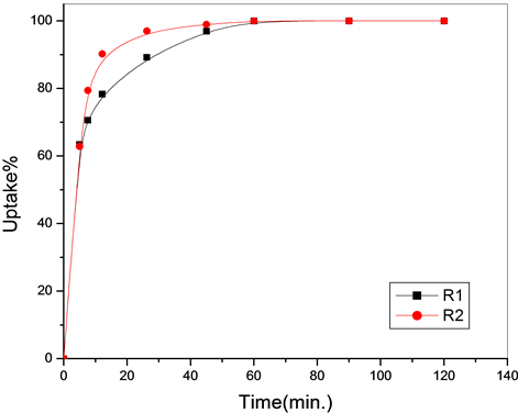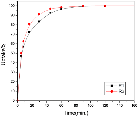 The uptake percentage increases with increasing the weight of the polymeric materials and reached its maximum value at 40 mg for all metal ions, which means that this is optimum concentration for the sorption process.