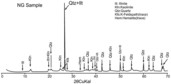 material consists of quartz (in the form of sand) associated with clay minerals (illite, kaolinite) while in NG clay material, in addition to quartz (in the form of sand) and kaolinite, other minerals such as k-feldspars and hematite are also present [12] .