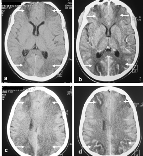 Figure 1. Encephalic CT scan showed hypodensity ranges of approximately 20 Hounsfield units related to junctional seat cytotoxic edema (arrows) with vascular repealing after injection, without mass detected and no abnormality of the pituitary region.