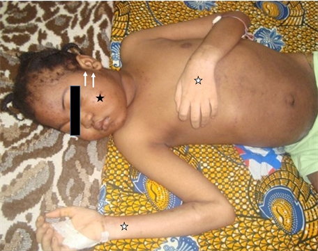 Figure 2. Photograph of the patient showing facio-troncular obesity, skin depigmentation (white stars), stretch marks, acne (black star), hirsutism (arrows).