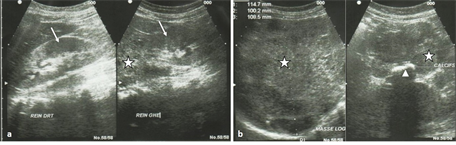 Figure 3. Phtographs of Abdominal ultrasound. A tissue formation developed at the expense of the left adrenal measuring 114 mm × 108 mm × 100 mm (stars in (a) and (b); punctuated with calcification in clumps (head of arrow in (b) of compatible appearance with AC; kidneys were of normal appearance (arrows in (a)) and there was no liver injury.