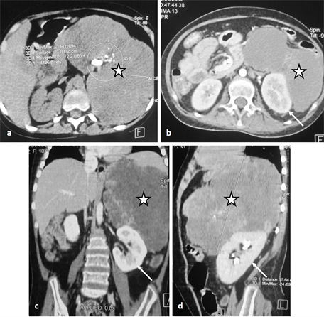 Figure 4. Abdominal CT scan showing a huge tissue mass adrenal left multilobed evaluated at 1550 cm3 (stars in (a)-(d)) punctuated by different size calcifications (circle), raised after injection, driving the left kidney (arrows in (b)-(d)) without invading it and without infiltration of the adjacent fat; there are no deep lymphadenopathies. The aspect was compatible with a left adreno-cortical carcinoma.